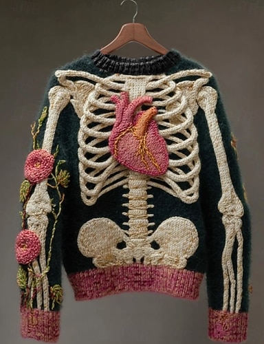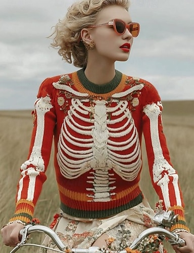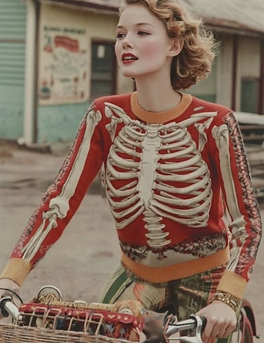 سويت شيرت نسائي هيكل عظمي جذاب كاجوال رسومي هيكل عظمي على شكل رقبة دائرية مكون من عدة قطع بأكمام طويلة قياسات عادية متماسكة أسود وردي خريف شتاء