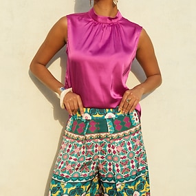 بنطلون واسع الساق من الساتان بطبعة زهور هندسية، مناسب للعطلات غير الرسمية