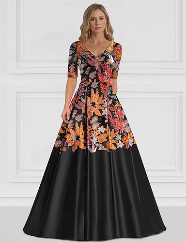 A-الخط طول الأرض فساتين السهرة أنيق زهري سبليت عالية نصف كم V رقبة حفلة في الحديقة زفاف ساتان تفتا ظهر درابيه مع طباعة الأزهار انقسام جيبة