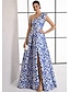 A-الخط طول الأرض فساتين السهرة منفوش الزي الرسمي أنيق بدون كم كتف واحد رسمي ضيف حفل زفاف جيبة ساتان مع طباعة الأزهار انقسام جيبة