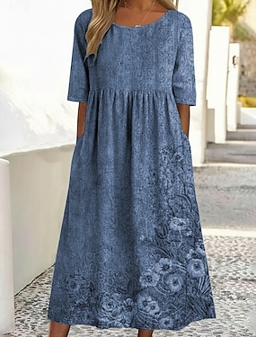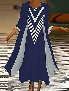 نسائي فستان طويل ماكسي لباس غير رسمي لباس صيفي فستان بوهو أنيق كاجوال عطلة مناسب للبس اليومي مواعدة عادي هندسي 3/4 الكم رقبة عالية مدورة أبيض أزرق البحرية أخضر الصيف