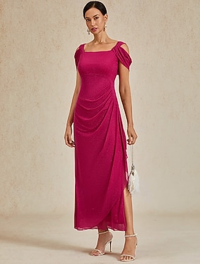 نسائي فستان طويل فستان شيث أنيق ضيف حفل زفاف حفلة كوكتيل مكشكش كشكش تل سباركل عادي لون الصلبة بدون كم مع حمالة جفاء وردي بلاشيهغ