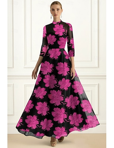A-الخط طول الأرض فساتين السهرة الزي الرسمي أنيق يوميا فساتين شبه رسمية 3/4 الكم رقبة عالية حفلة في الحديقة زفاف أورجنزا قماش الجاكار مع طباعة الأزهار