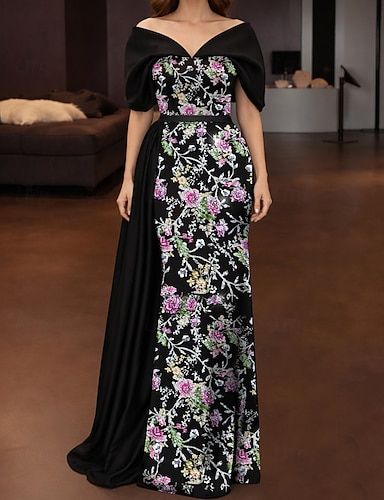 A-الخط طول الأرض فستان مشجر فساتين السهرة أنيق عتيق زهري كم قصير رقبة باتو حفلة في الحديقة زفاف جيبة ساتان قماش الجاكار مع طباعة الأزهار زهرة مطرزة شريطة