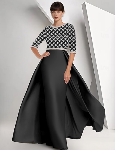عامودي طول الأرض مطرز بالخرز فستان رسمي فستان والدة العروس فساتين متنوعه حزب فساتين أنيق فستان أسود قصير حريري كم قصير رقبة عالية مدورة حفلة في الحديقة زفاف ساتان مع روش كشاكش انقسام