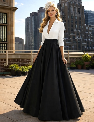 A-الخط طول الأرض فساتين السهرة منفوش الزي الرسمي أنيق حفلة مكعبات الألوان كم طويل V رقبة زفاف ربطة عنق سوداء ضيف حفل زفاف الخريف ساتان سترتش مع روش جيبة