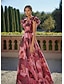 فستان سهرة خط A أحمر وأسود أنيق فستان رسمي زفاف رسمي بطول الأرض بأكمام قصيرة عن الكتف مع جيب من المخمل مع وطيّات