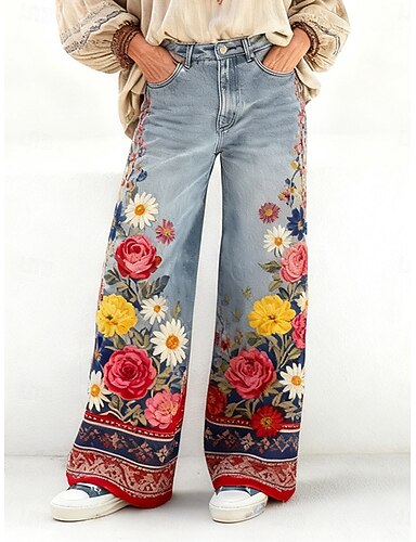 نسائي ساق عريضه تشينوز العطلة عتيق النمط العرقي مكتمل الطول خصر عالي ورد الرسم جيب طبع مريح ناعم مرن نسبياً الأماكن المفتوحة عطلة شارع أزرق الربيع الخريف الشتاء فضفاض صالح