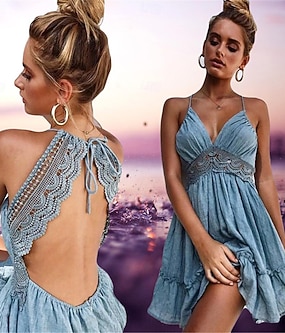 نسائي فستان دانتيل فستان قصير دانتيل بقع عطلة شاطئ مثيرة كاجوال حمالات سباكيتي بدون كم أسود أبيض أزرق داكن اللون