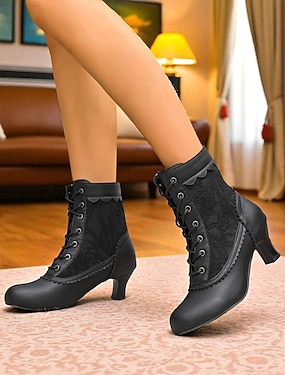 حذاء نسائي فيكتوري برباط حتى منتصف الساق بتصميم دانتيل عتيق ولمسات من الجلد الصناعي - طراز قديم للارتداء في الحفلات التنكرية والمناسبات الرسمية والارتداء اليومي