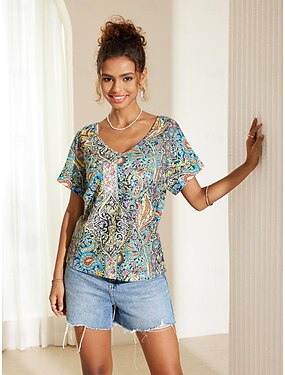 تي شيرت نسائي بلوزة بوهيمي بطباعة كراسي قصيرة بأكمام على شكل حرف V كاجوال فضفاضة متعددة الألوان خفيفة صيفية