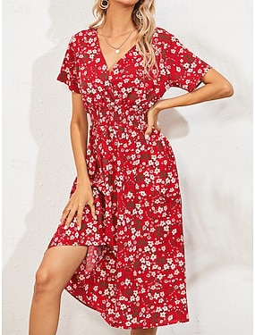 فستان سهرة أنيق متوسط الطول للنساء بحلقات قصيرة الأكمام فستان غير رسمي فستان محايد صيفي ملابس أنيقة عملية مناسبة فضفطة بتصميم زهور أسود وأبيض أحمر أزرق بنفسجي