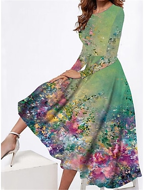 فستان ميدي نسائي فستان غير رسمي فستان شتوي فستان متأرجح موضة محتشمة رسمية في الهواء الطلق حفلة مقاس عادي مزهر كم طويل رقبة طاقم أخضر ربيع خريف شتاء خريف
