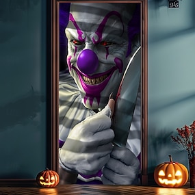 أغطية أبواب الهالوين، شغب المهرج بواسطة توم وود، قماش باب، ستارة باب زينة، خلفية لافتة باب للباب الأمامي، مزرعة لعيد الهالوين، زينة داخلية وخارجية
