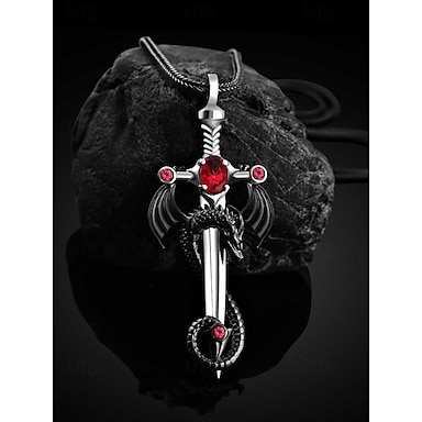 قلادة رجالية على شكل سيف تنين قوطي مع أحجار كريمة حمراء - طراز عتيق، مثالية لحفلات الهالوين والمناسبات القوطية