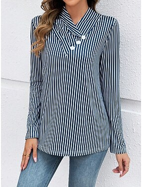 نسائي تي شيرت الرسم مخطط عتيق أنيق كاجوال كم طويل V رقبة قمصان عادية مناسب للبس اليومي عطلة نهاية الاسبوع Buttons طباعة أزرق البحرية الخريف الشتاء