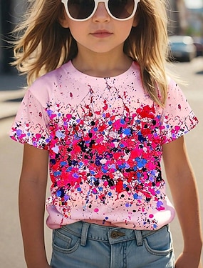 للفتيات 3D الرسم كنزة مطبوعة كم قصير الصيف الربيع موضة أساسي أطفال 4-12 سنة رقبة العمل الأماكن المفتوحة فضفاض مناسب للبس اليومي عادي