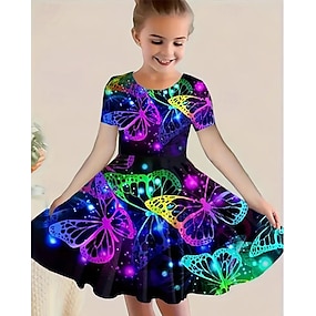 الفتيات 3D الرسم فراشة فستان كم قصير الصيف الربيع عطلة مناسب للبس اليومي مناسب للعطلات جميل حلو أطفال 4-12 سنة لباس غير رسمي فستان شكل حرف A طول الركبة عادي