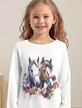 للفتيات 3D حيوان حصان تي شيرت كنزة مطبوعة كم طويل الربيع الخريف موضة أساسي أطفال 4-12 سنة رقبة العمل الأماكن المفتوحة فضفاض مناسب للبس اليومي عادي