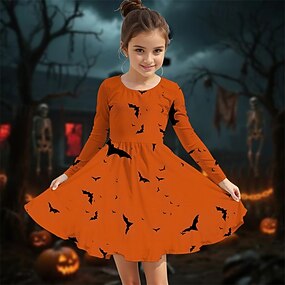 عيد الرعب الفتيات 3D قرع خفاش فستان كم طويل الصيف الربيع عطلة مناسب للبس اليومي مناسب للعطلات أميرة جميل حلو أطفال 4-12 سنة لباس غير رسمي فستان شكل حرف A طول الركبة عادي