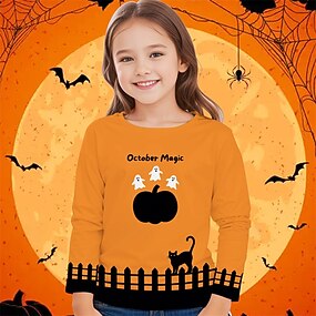عيد الرعب للفتيات 3D كارتون قرع تي شيرت كنزة مطبوعة كم طويل الربيع الخريف موضة أساسي أطفال 4-12 سنة رقبة العمل الأماكن المفتوحة فضفاض مناسب للبس اليومي عادي