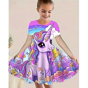 الفتيات 3D آحادي القرن فستان كم قصير الصيف الربيع عطلة مناسب للبس اليومي مناسب للعطلات أميرة جميل حلو أطفال 4-12 سنة لباس غير رسمي طول الركبة عادي