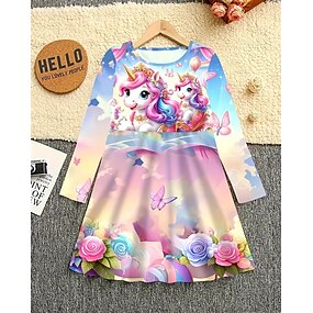 الفتيات 3D الرسم آحادي القرن فستان كم طويل الصيف الربيع عطلة مناسب للبس اليومي مناسب للعطلات أميرة جميل حلو أطفال 4-12 سنة لباس غير رسمي فستان شكل حرف A طول الركبة عادي