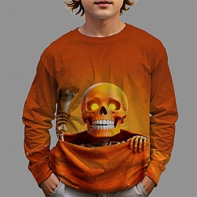 عيد الرعب للصبيان 3D جماجم تي شيرت كنزة مطبوعة كم طويل الربيع الخريف موضة أساسي أطفال 4-12 سنة رقبة العمل الأماكن المفتوحة فضفاض مناسب للبس اليومي عادي