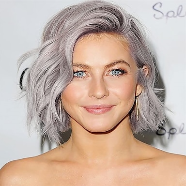 شعر مستعار مموج رمادي فضي مع غرة للنساء، شعر مستعار رمادي متدرج بطول الكتف، شعر مستعار بوب مجعد بمظهر طبيعي، أبيض فضي مع جذور داكنة، شعر صناعي للاستخدام اليومي في الحفلات.