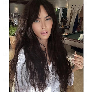 شعر مستعار أسود مع غرة للنساء، شعر مستعار طويل مموج ومجعد، شعر مستعار صناعي ذو مظهر طبيعي، شعر مستعار مقاوم للحرارة للاستخدام اليومي في الحفلات