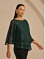 بلوزة نسائية برقبة دائرية من الشيفون المزخرف بنسيج محترق وأكمام واسعة بطول ثلاثة أرباع وحاشية متعددة الطبقات أنيقة للحفلات والعطلات