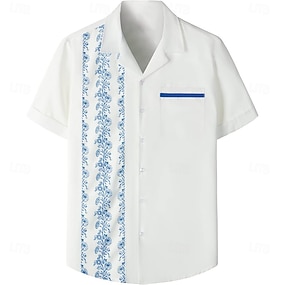 رجالي ورد قميص البولينج زر حتى القميص كم قصير كاجوال ملابس الرياضة الصيف الربيع الياقة الكوبية زرر جيب أبيض