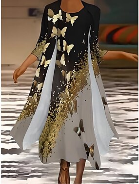 نسائي مجموعة اللباس لباس صيفي العطلة كاجوال ظل ورد طباعة فستان طويل 3/4 الكم رقبة عالية مدورة ضيف حفل زفاف عيد ميلاد أسود أزرق سماوي أزرق داكن الصيف الربيع عادي