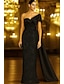فستان أسود ضيق فستان مسائي أنيق فستان رسمي بطول الأرضية بأكمام قصيرة ذو كتف واحد وجيب من كريب مرن مع ريشة
