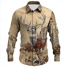 رجالي الرنة النباتات غابة قميص زر حتى القميص كم طويل ريترو خمر الأماكن المفتوحة التخييم والتنزه الصيد الربيع الخريف طوي طباعة ثلاثية الأبعاد قميص بياقة بني