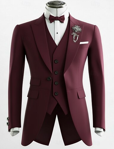 ملك الرجال توكسيدو بدلات الحفلات حفلة تخرج / حفلة موسيقية / حفلة رقص زفاف عنابي الربيع، الخريف، الشتاء، الصيف بدلة شق الصدر للذروة ترف رسمي لون سادة قياس أساسي ستاندرد 3 قطعة مجموعة زر واحد صدر واحد