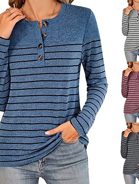 نسائي تي شيرت مخطط موضة أنيق أساسي كم طويل رقبة عالية مدورة قمصان عادية مناسب للبس اليومي عطلة نهاية الاسبوع Buttons طباعة أزرق البحرية كاكي رمادي فاتح الصيف