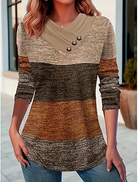 نسائي تي شيرت الرسم هندسي ألوان متناوبة عتيق أنيق كلاسيكي كم طويل V رقبة قمصان عادية مناسب للبس اليومي Buttons طباعة غير متماثل بني الخريف الشتاء