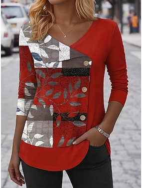 بلوزة نسائية تيشرتات طويلة فتحة V بأكمام طويلة أزرار تصميمات رسومية هندسية عتيقة موضة كاجوال تيشرتات عادية طباعة يومية رقعة حمراء زرقاء بنفسجية خضراء ربيع خريف شتاء قبل الخريف