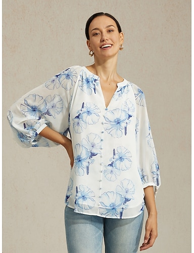 بلوزة شيفون نسائية بطبعة زهور حبرية أنيقة غير رسمية للمكتب لربيع وصيف وخريف