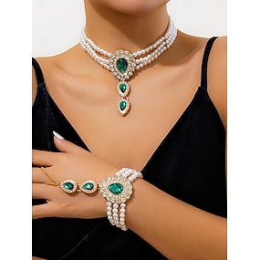 مجموعة مجوهرات نسائية من اللؤلؤ والزمرد - قلادة أنيقة من أحجار الراين وسوار للرقص في قاعة الرقص أو الحفلات الراقصة أو الحفلات المسائية
