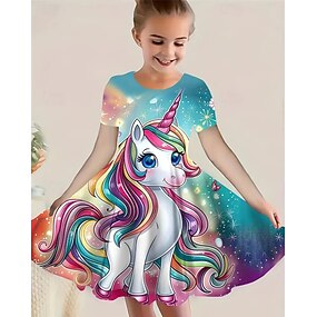 الفتيات 3D الرسم آحادي القرن فستان كم قصير الصيف الربيع عطلة مناسب للبس اليومي مناسب للعطلات أميرة جميل حلو أطفال 4-12 سنة لباس غير رسمي طول الركبة عادي