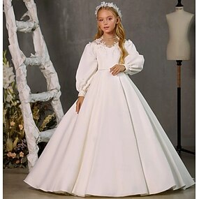 أطفال للفتيات فستان فتاة الزهور فستان المناولة الأولى لون الصلبة بدون كم كم طويل أداء زفاف مناسب للحفلات شبكة أميرة حلو شبكة قصة متوسطة فستان شيث فستان تل الصيف الربيع الخريف الاطفال عاجي