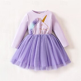 أطفال للفتيات فستان آحادي القرن كم طويل الأماكن المفتوحة فضفاض بقع موضة بديع بوليستر فوق الركبة لباس غير رسمي فستان شكل حرف A فستان تل الصيف الربيع 4 سنوات + وردي بلاشيهغ أرجواني القرمزي