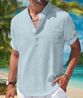 رجالي قميص كتان قميص بياقة الفرقة قميص صيفي ملابس الشاطئ سهل عطلة كوريس أبيض أزرق كاكي رمادي كم قصير رقبة طوقية مرتفعة للربيع والصيف ملابس أساسي