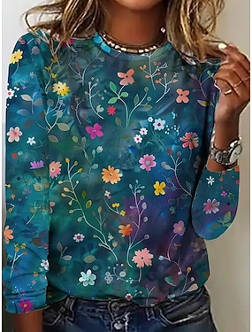 تي شيرت نسائي برقبة دائرية بأكمام طويلة تونك مزهّر جرافيك كاجوال عادية طباعة يومية أزرق ربيع خريف