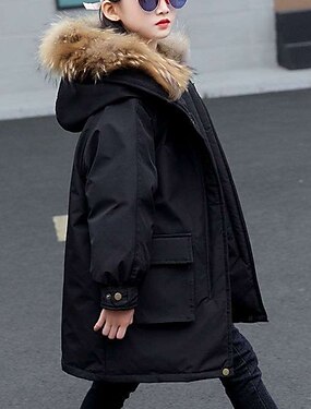 أطفال للفتيات سترة أسفل سترة خارجية سترة البخاخ لون الصلبة موضة قبة فرو الدفء ضد الرياح الأماكن المفتوحة معطف ملابس خارجية 4-12 سنة الخريف أسود أصفر أحمر