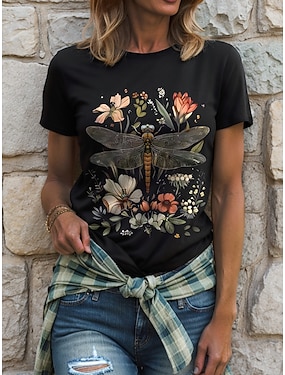 نسائي تي شيرت ورد الرسم اليعسوب عتيق أنيق كلاسيكي كم قصير رقبة عالية مدورة رقبة دائرية قمصان عادية مناسب للبس اليومي عطلة نهاية الاسبوع طباعة أسود أبيض أصفر وردي بلاشيهغ أحمر الصيف الربيع