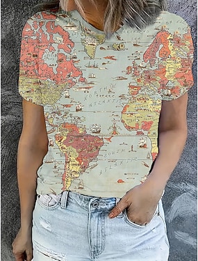 نسائي تي شيرت قمم الصيف الرسم خريطة كلاسيكي كاجوال كم قصير رقبة عالية مدورة قمصان قصيرة مناسب للبس اليومي عطلة نهاية الاسبوع طباعة التقزح اللوني الصيف الربيع الخريف