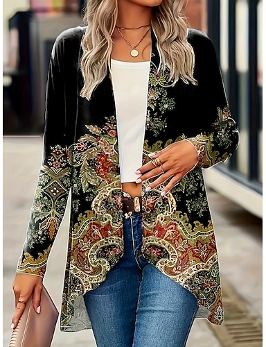 نسائي معطف شتوي ترانش كوت خفة الوزن مريح طباعة الأمام مفتوح عتيق موضة كاجوال بوهو فينتاج هندسي عطلة فضفاض طويلة نوع من غير طوق عادي كم طويل ملابس خارجية أسود البيج الربيع الخريف
